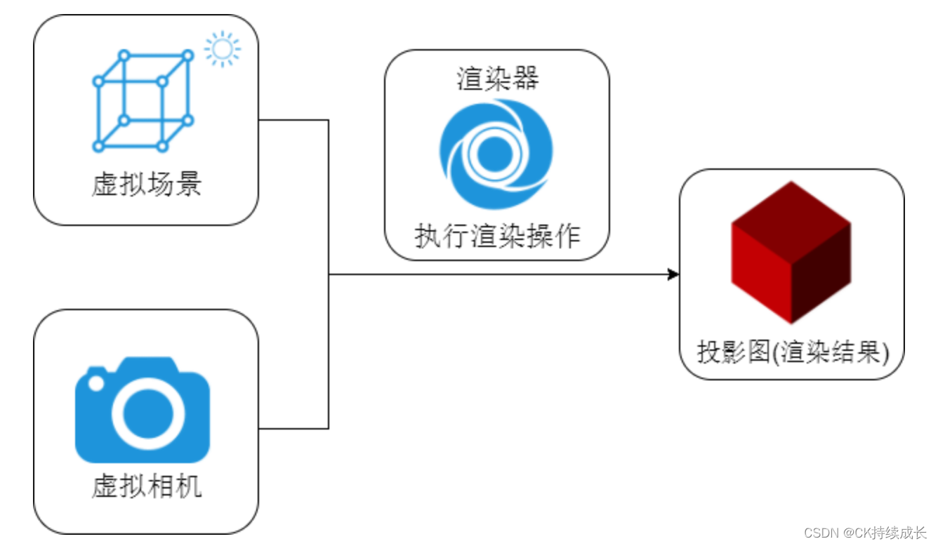 - 渲染器(Render): 通过上面的场景和相机我们已经构建出了虚拟的三位立体场景,相机的位置和角度也设置好了,那么剩下就是拍照了。拍照就相当于是在二维的web平面上去展示3D的立体效果在某个视角的一个图片效果。当我们换一个视角,渲染器也不会有不同的投影效果。