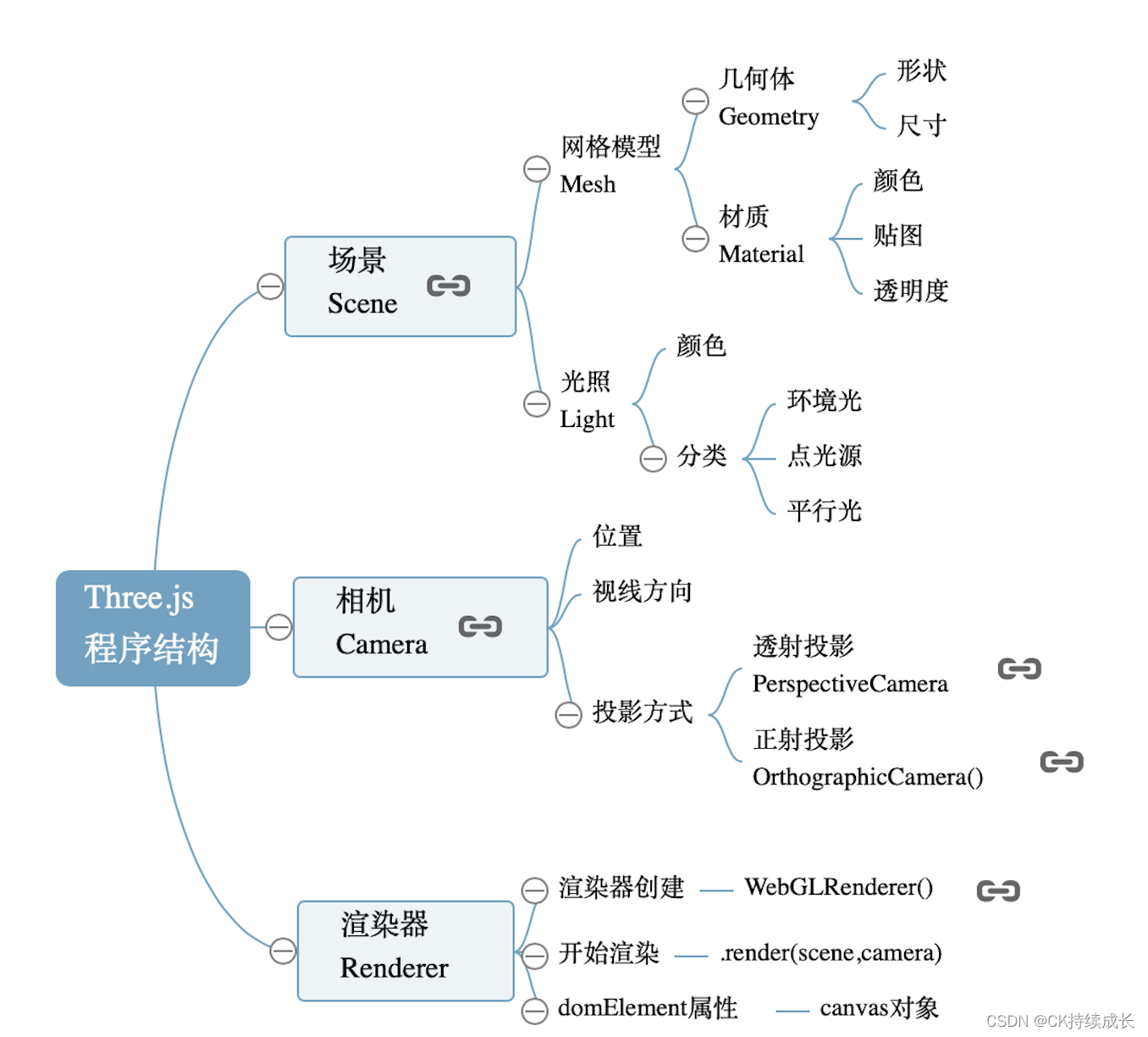 我们已经大概知道threejs的一个构建过程和渲染流程。通过上面的示例,整个程序的构成如下图(参考资料图片):