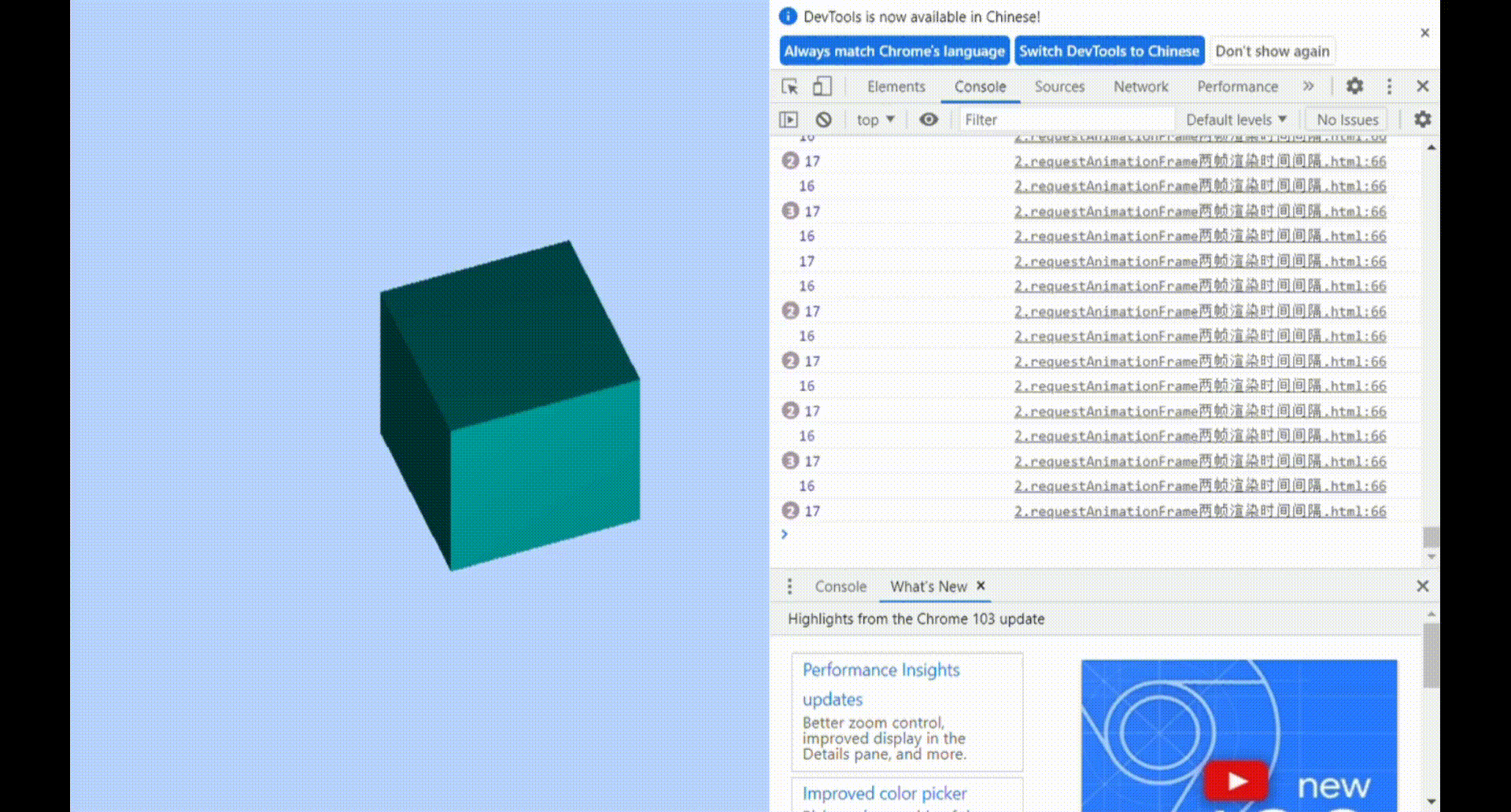 我们可以创建两个临时变量T1和T0去记录本次执行渲染和上次执行渲染所需时间,再将他们相减,就得到了两帧之间的时间间隔,发现稳定在17ms左右,58的fps,相较于我们自己设置的时间周期,它的fps更高,也没有局限性