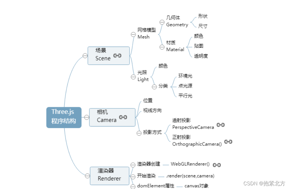 主要分为三大结构:场景Scene 相机Camera 渲染器Renderer