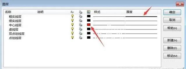 其中粗实线层可以设置厚度为0.35,0.4,或0.5。中心线层颜色为红色。当然你也可以设置花哨一些,但没什么必要。