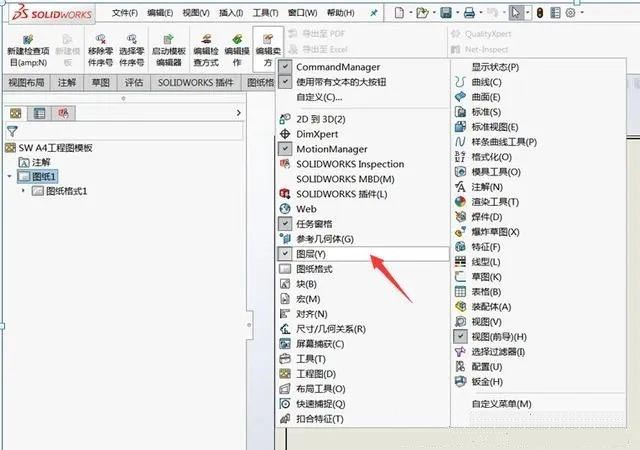第一步:打开工程图模板文件,一定得是文件类型为.drwdot的工程图模板文件。在工具栏任意位置右击,在弹出菜单里勾选“图层”工具栏。