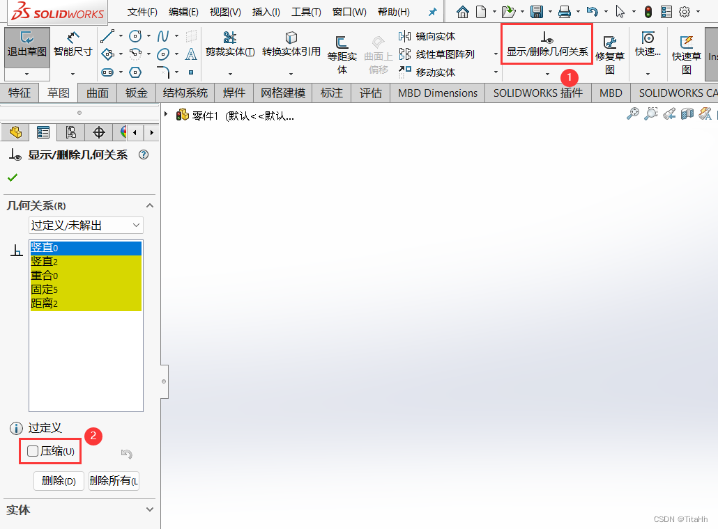 4 、可以点击工具栏中的"显示/删除几何关系"的找出草图中过定义或悬空的几何关系。然后点击“压缩”来使草图完全定义。