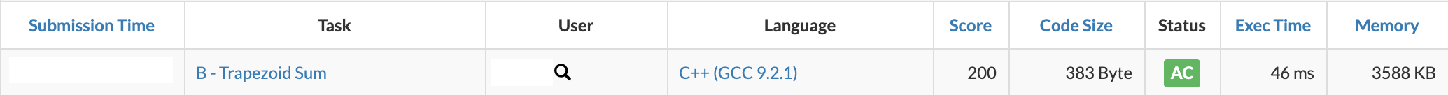 以上就是年轻彩虹最近收集整理的关于AtCoder题解—— AtCoder Beginner Contest 181 —— B - Trapezoid Sum题目相关题解报告的全部内容,更多相关AtCoder题解——内容请搜索靠谱客的其他文章。