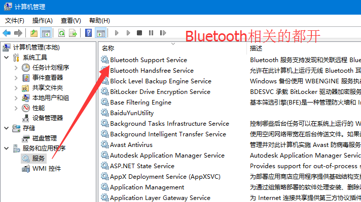 首先蓝牙服务要开启(如下图),支持蓝牙的台式电脑或笔记本在桌面右下角会有蓝牙小图标。