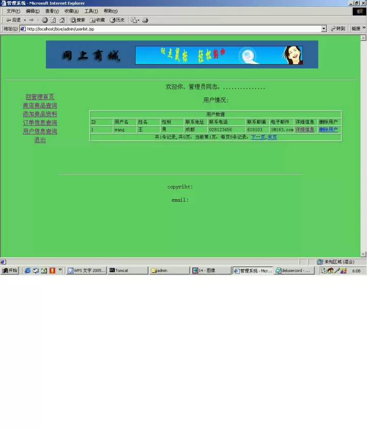 对商品的删除更为简便,只要在选择商品类别和商品型号后,只要点击“删除”就能够成功实现操作。对于用户管理,管理员查看当前所有用户的相关信息,并且能够删除带有不良企图的非法注册用户的ID,操作起来简便、快捷。在测试的过程中同样发现和用户模块相同的致命性错误,就是可以直接通过地址栏而不需要验证就可以具备管理员权限。这是一个相当大的漏洞。最后也通过session变量得以解决这个问题。