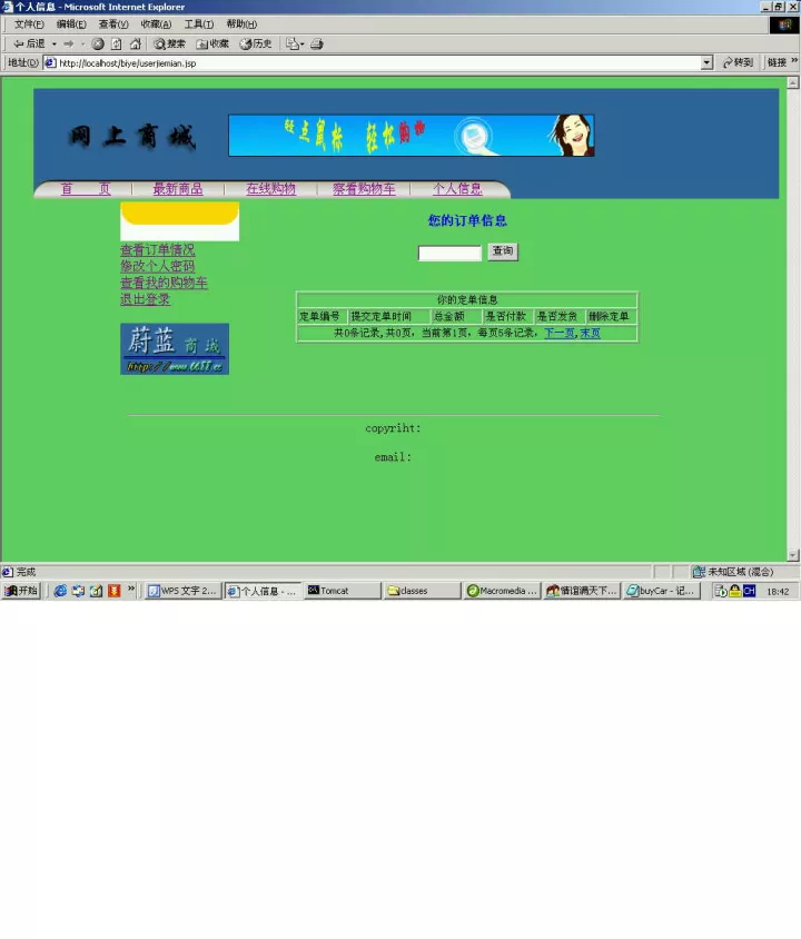 注册成功以后回到主页登录,进入用户界面。点击商品查询以及购物等页面基本正常,但是在测试过程中发现了非常严重的问题,有的页面本来应该在登录以后才能访问,比如查看自己定单以及购买商品等注册登录用户的页面。而在不用登录直接在IP地址栏输入地址也可直接访问。这显然是不现实的。于是运用控制变量session来解决了这个问题,添加如下代码: