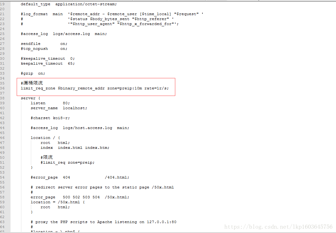 增加一行该配置,$binary_remote_addr,限流维度,表示对每一个ip进行限流,1r/s表示1秒一个