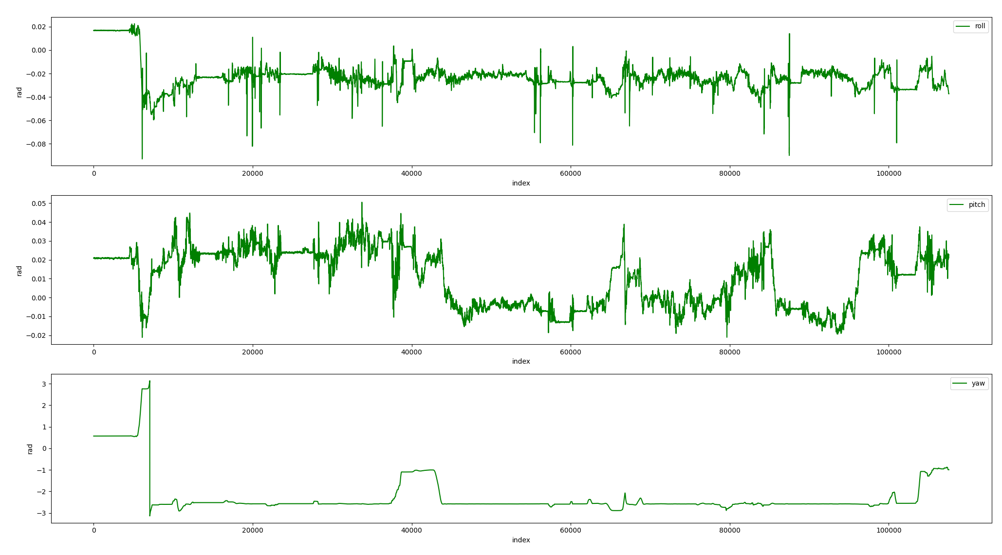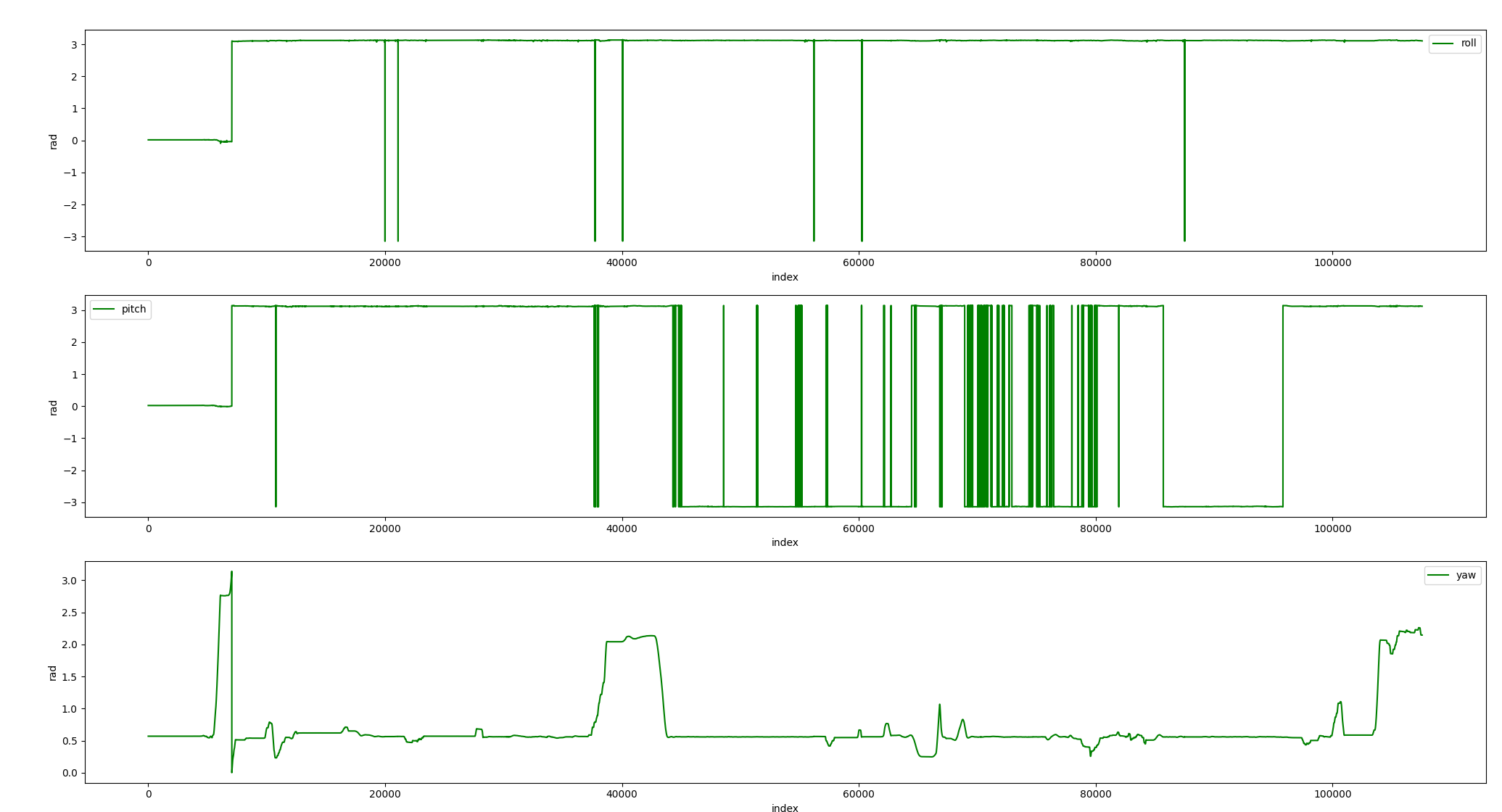 由于无人车在近似平面上运动,因此yaw角可能取值±180°,roll和pitch变化很小才对。但是使用eulerAngles(2,1,0)时,出现roll,pitch达到正负180的现象,明显错误。如下图: