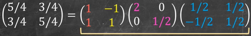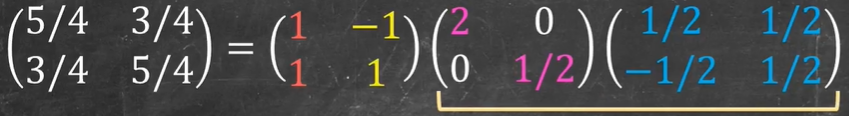 A=XLambda X^{-1}= begin{bmatrix} 1 & -1\ 1 & 1 end{bmatrix} begin{bmatrix} 2 & 0\ 0 & 1/2 end{bmatrix} begin{bmatrix} 1/2 & 1/2\ -1/2 & 1/2 end{bmatrix}