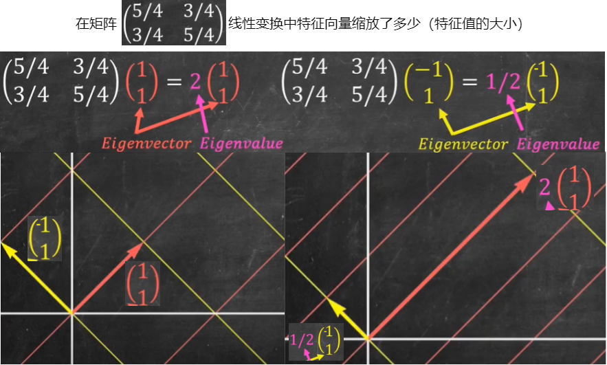 A=begin{bmatrix}5/4 & 3/4\ 3/4 & 5/4end{bmatrix}\ ~\ det A=(frac{5}{4})^2-(frac{3}{4})^2=1=lambda_1lambda_2\ ~\ tr A=frac{5}{4}+frac{3}{4}=frac{5}{2}=lambda_1+lambda_2\ ~\ begin{cases} lambda_1lambda_2=1\ lambda_1+lambda_2=frac{5}{2} end{cases}\ ~\ lambda_1=frac{1}{2}、lambda_2=2\ ~\ Avec{x}_1=frac{1}{2}vec{x}_1、Avec{x}_2=2vec{x}_2\ ~\ begin{bmatrix} 5/4 & 3/4\ 3/4 & 5/4 end{bmatrix} begin{bmatrix} a_1\ a_2 end{bmatrix}=frac{1}{2} begin{bmatrix} a_1\ a_2 end{bmatrix}、 begin{bmatrix} 5/4 & 3/4\ 3/4 & 5/4 end{bmatrix} begin{bmatrix} a_3\ a_4 end{bmatrix}=2 begin{bmatrix} a_3\ a_4 end{bmatrix}\ ~\ a_1=-a_2、a_3=a_4\ ~\ We take a_1=-1、a_2=1、a_3=1、a_4=1\ ~\ vec{x}_1= begin{bmatrix} 1\ 1 end{bmatrix}、 vec{x}_2= begin{bmatrix} -1\ 1 end{bmatrix}