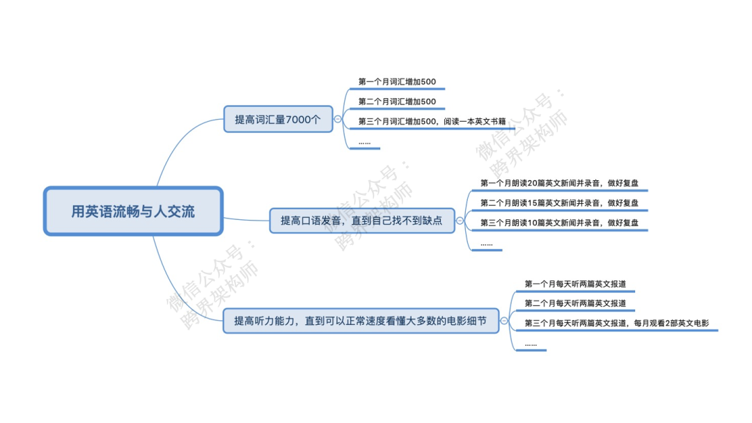 所以你可以把这个大目标分解一下。比如,分为提高词汇量,提高口语发音,提高听力能力。