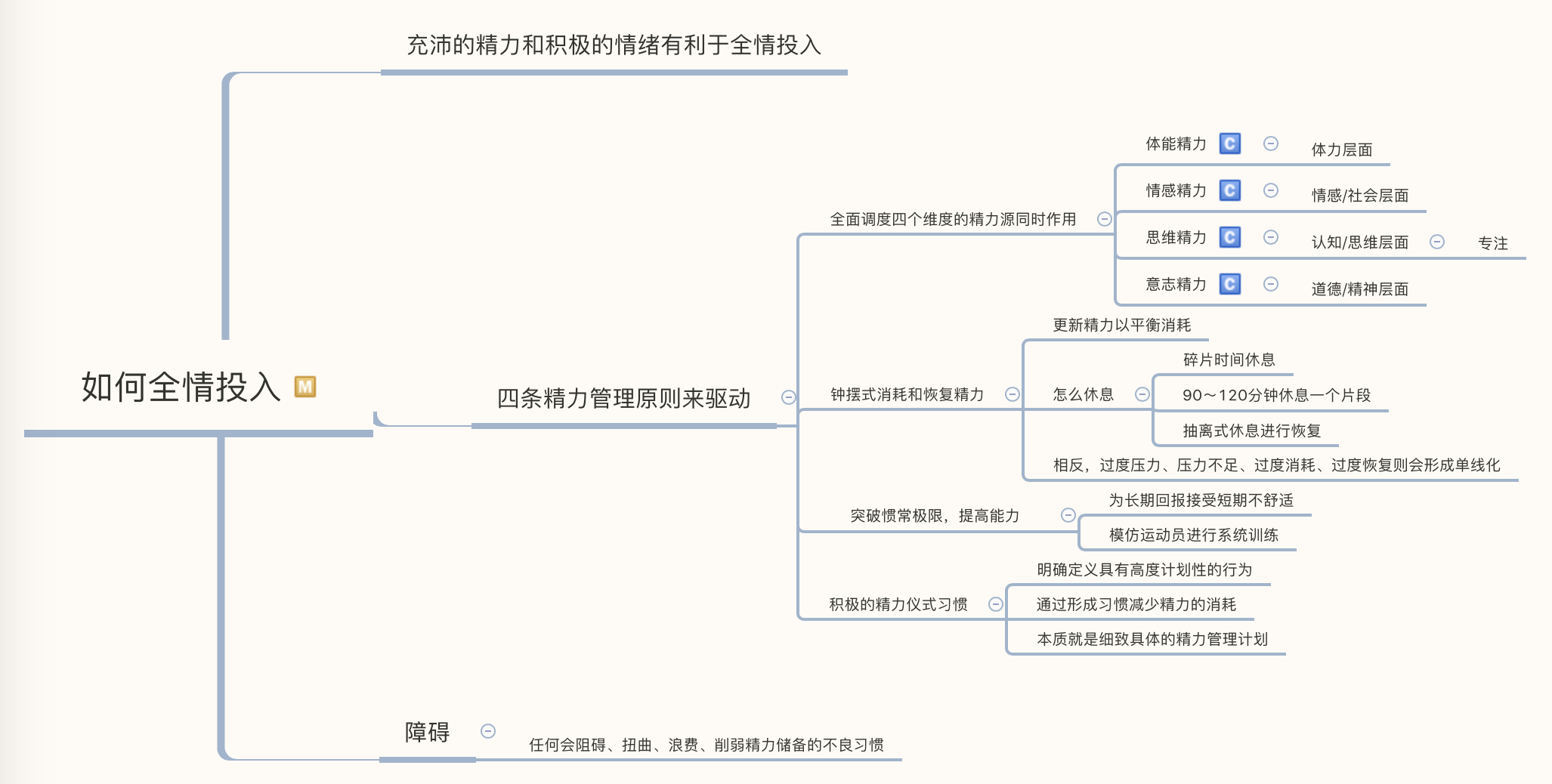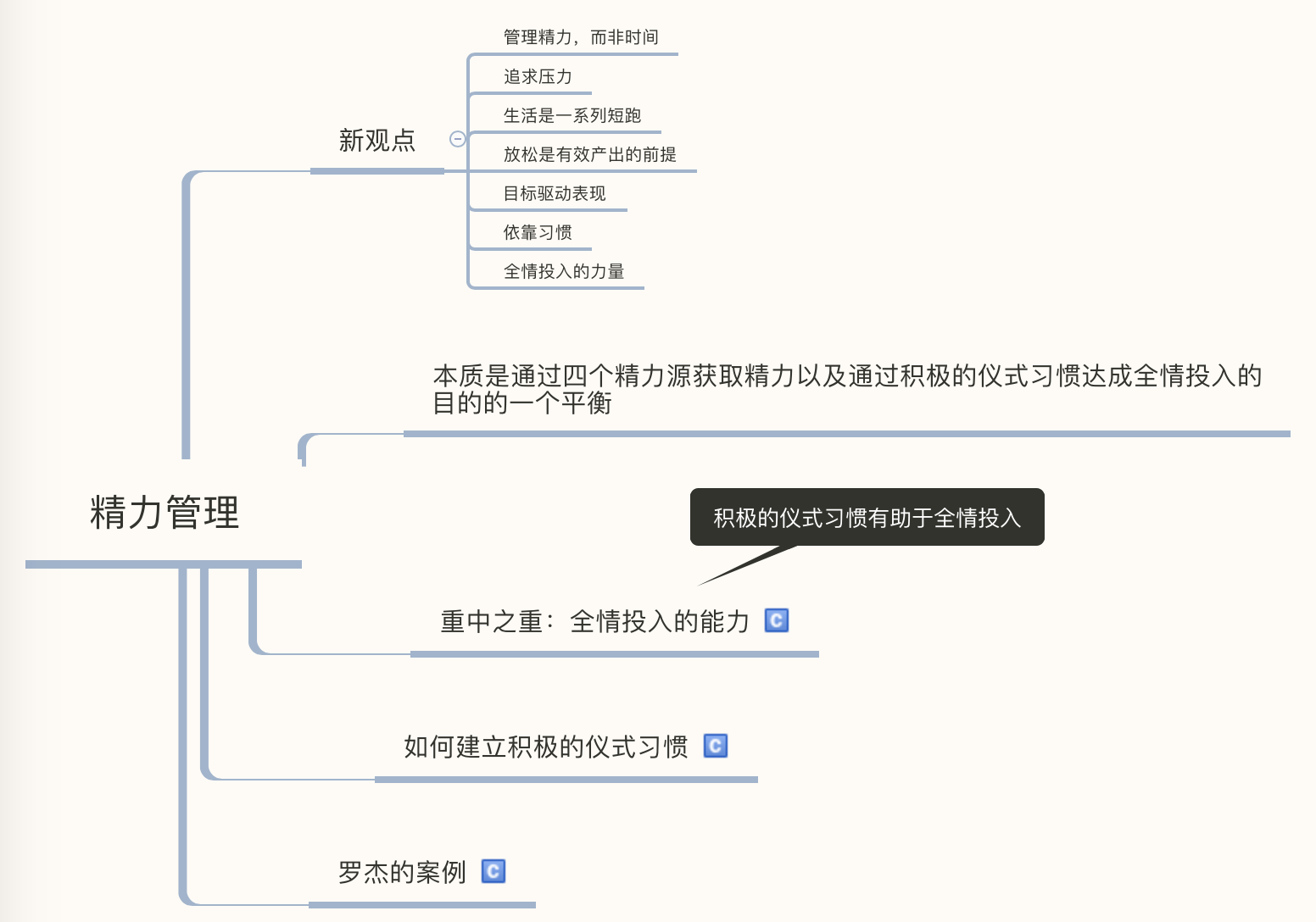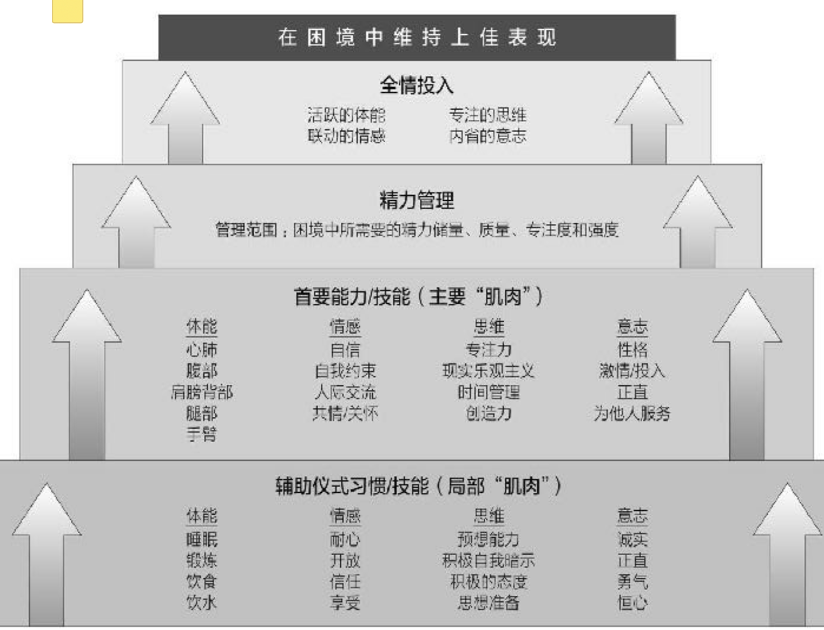 精力管理的最高效表现是全情投入,它在工作和私人生活之间画上清晰的分界线,让人全心投入每项任务,从根本上改变人们的生活方式。精力管理提出管理精力而非时间,通过建立积极的仪式习惯实现高效的精力管理,从而获得全情投入的能力。高效的精力管理对于建立高产出的全情投入起到至关重要的作用,那么精力哪里来的呢?作者提出四个精力源、四条关键的精力管理原则以及建立积极的仪式习惯的三个重要步骤。