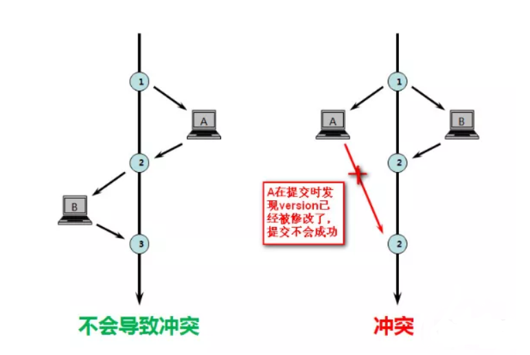 如图,如果更新操作顺序执行,则数据的版本(version)依次递增,不会产生冲突。但是如果发生有不同的业务操作对同一版本的数据进行修改,那么,先提交的操作(图中B)会把数据 version 更新为 2,当 A 在 B 之后提交更新时发现数据的 version 已经被修改了,那么 A 的更新操作会失败。