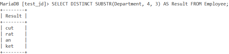 SELECT DISTINCT SUBSTR(Department, 4, 3) AS Result FROM Employee;