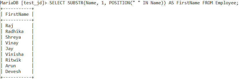 SELECT SUBSTR(Name, 1, POSITION(“ “ IN Name)) AS FirstName FROM Employee;
