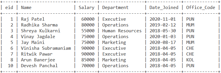 如何从 Department 列值中从位置 4 开始提取 3 个字符?让我们不要返回重复的值。为此,我们将使用DISTINCT关键字。