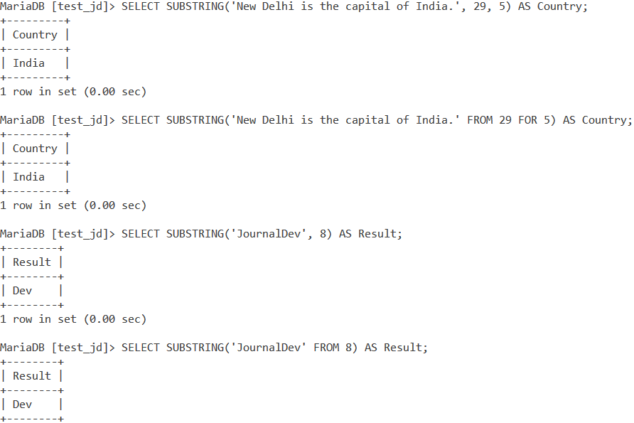SELECT SUBSTRING(‘New Delhi is the capital of India.’, 29, 5) AS Country; SELECT SUBSTRING(‘New Delhi is the capital of India.’ FROM 29 FOR 5) AS Country; SELECT SUBSTRING(‘JournalDev’, 8) AS Result; SELECT SUBSTRING(‘JournalDev’ FROM 8) AS Result;