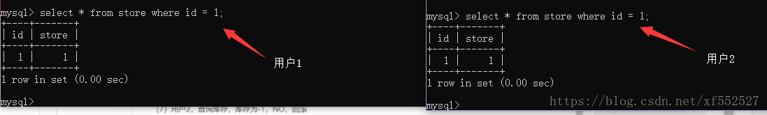 (1)用户1查询id为1的商品的库存为1,刚查完还没有进行修改库存