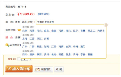 例如在京东的前台上,客户在选择不同收货区域时,系统会根据各个分仓的库存数据作出显示,是否有现货,以帮助客户购买,达到更好的客户体验(图1)。