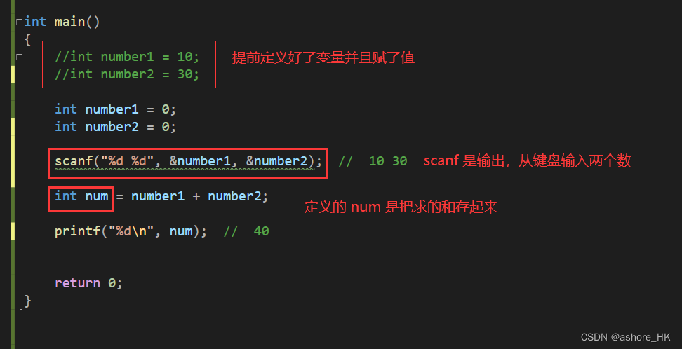 程序的开始是 main() 函数,相当于入口,所以这个 main() 函数有且只有一个。我们输出一句话,所以需要用到 printf 函数,但是 printf 函数是库里面的函数,属于别人的,我们用的话需要调用库里面的头文件,也就相当于用别人东西给别人打个招呼。