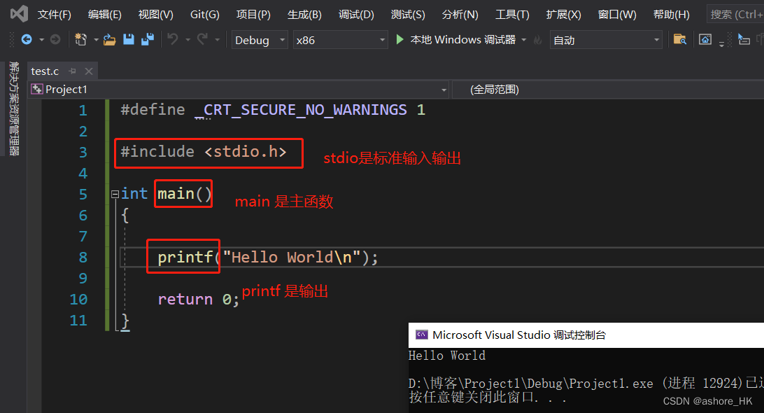 先来上手写第一个程序,要求输出 Hello World ,这里用到的编写软件就是 VS2019,如下: