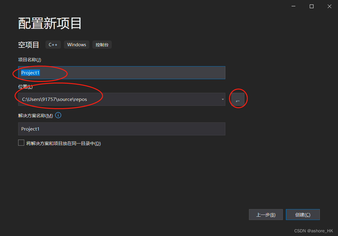 在给项目起名字还有你所要放到哪里,最后点创建: