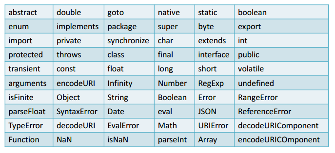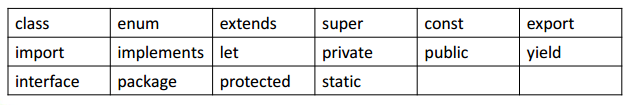 abstract、boolean、byte、char、class、const、debugger、double、enum、export、extends、final、float、goto