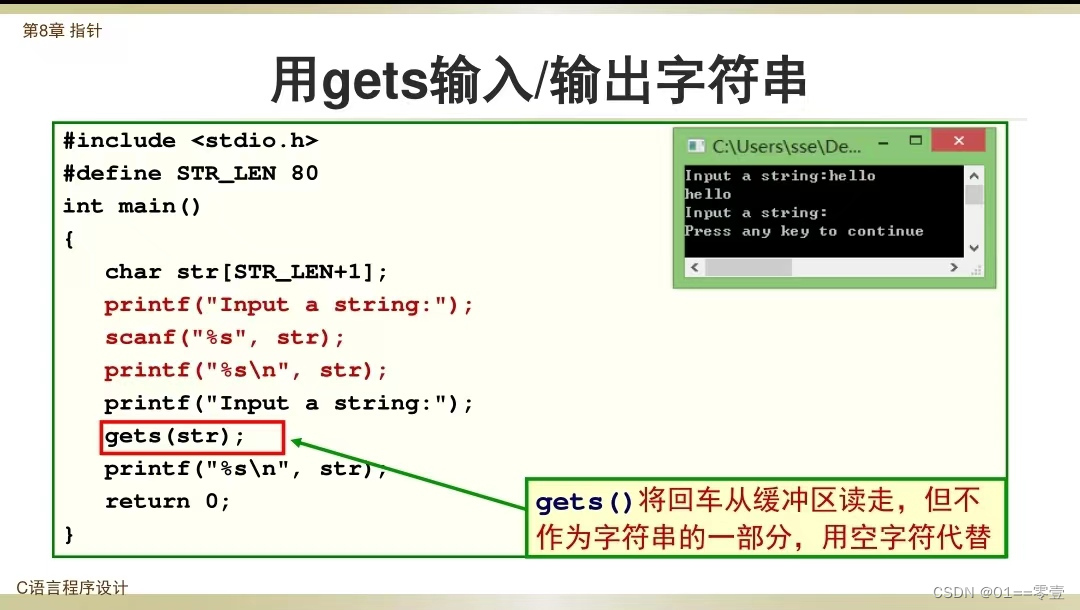 用 scanf ( ) 输入完字符串后,缓冲区中还存在着空白字符,而后的 gets ( ) 函数将把它读走 。