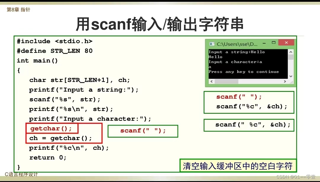 在调用 getchar ( ) 函数时,编译器会依次读取缓存区中的字符,其中包括空白字符,所以上述代码必须在输入 ch 字符前添加语句 getchar ( ),将缓存区中的空白字符读走,再使用 getchar ( ) 输入 ch 字符。除了使用 getchar ( ) 来读取空白字符,也可以用 scanf (" "),或者直接使用 scanf (" %c", &ch) 语句来输入 ch 字符。