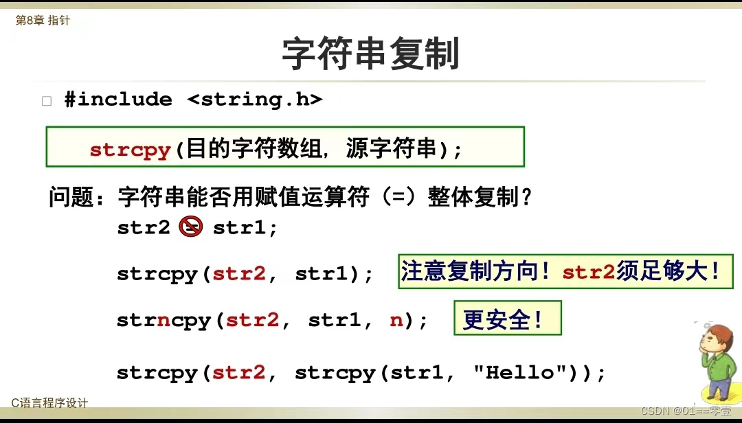 进行字符串复制时,要确保目的字符数组足够大,要大于等于源字符串的长度大小。