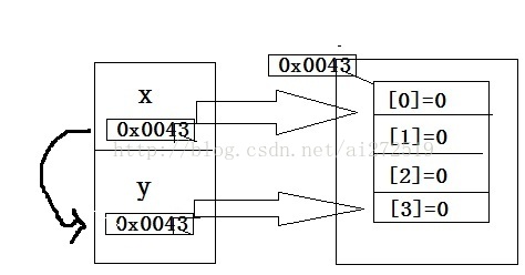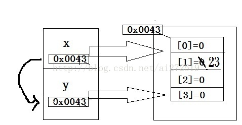 x赋值给y,y也获得数组的哈希值,从而指向数组。