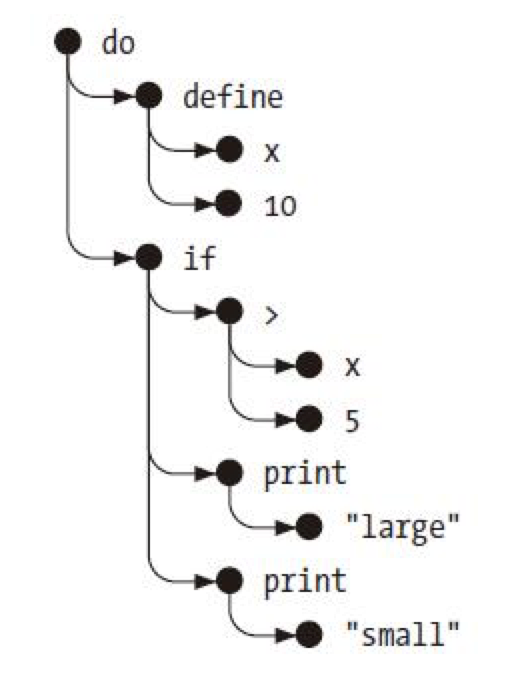 如上面第一段代码,有多少左括号,就有多少个application,括号中是参数。do, define, if, >, print 都是application。