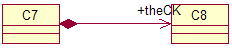 组合(也有人称为包容):一般是实心菱形加实线箭头表示,如上图所示,表示的是C8被C7包容,而且C8不能离开C7而独立存在。但这是视问题域而 定的,例如在关心汽车的领域里,轮胎是一定要组合在汽车类中的,因为它离开了汽车就没有意义了。但是在卖轮胎的店铺业务里,就算轮胎离开了汽车,它也是有 意义的,这就可以用聚合了。在《敏捷开发》中还说到,A组合B,则A需要知道B的生存周期,即可能A负责生成或者释放B,或者A通过某种途径知道B的生成 和释放。
