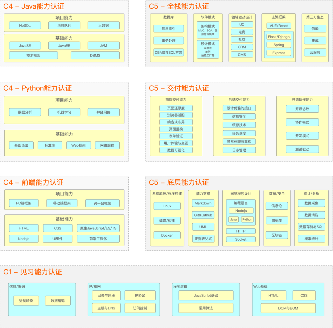 通过C4认证,能够胜任企业初中级软件开发岗位的工作且无需额外培养。C4认证除了需要熟练掌握相关语言的数据类型、基础语法和语言特性之外,还需要学习掌握与它们相关的开发框架,例如前端的VUE或React框架、Python的Flask或Django框架、后端Java的Spring全家桶。