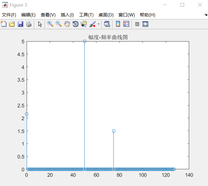 有3个频率:0Hz、50Hz、75Hz,应该分别在第1个点、第51个点、第76个点上出现峰值,其它各点应该接近0。实际情况如何呢?我们来看看FFT的结果的模值如图所示。