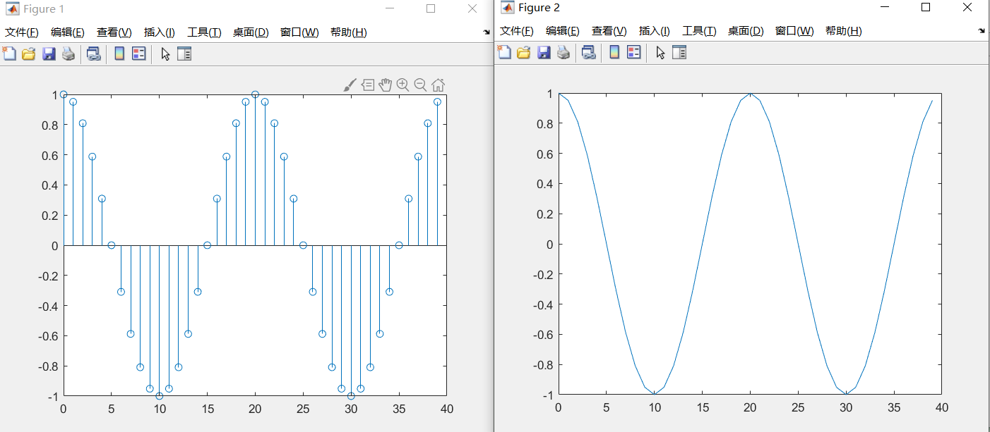 n = 0:39; y = cos(2*pi*(2*n)/40); stem(n,y); figure plot(n,y)