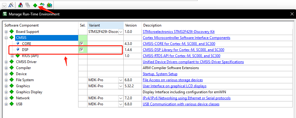 添加dsp数学库,由此就可以调用DSP库中的函数。