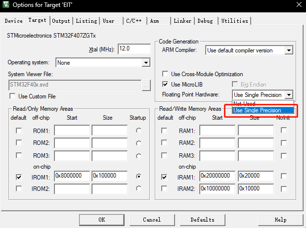 STM32F407是具有浮点运算(FPU)功能,可以通过MDK配置:target->Roating Point Hardware->Use Single Precison中打开。