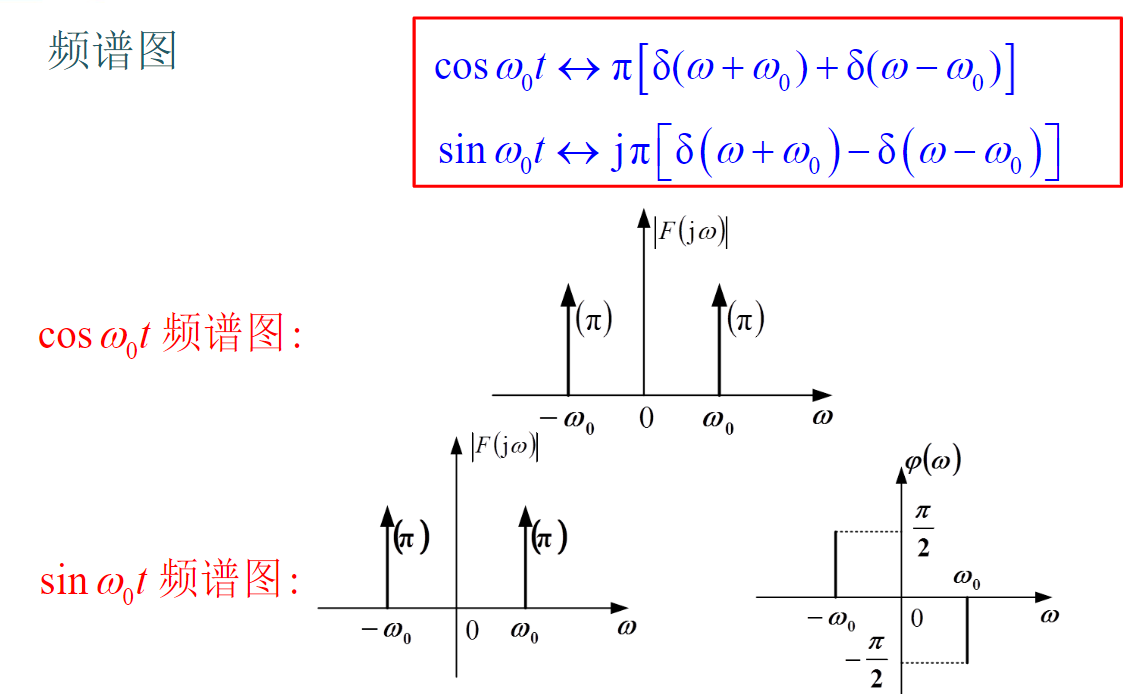 引入冲激函数后,周期信号的频谱可以用FT分析,各谐波频率分量处幅度为∞,用冲激函数表示