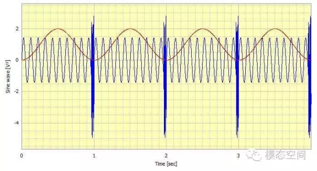 现在,如果信号不稳定,如图4所示,结果会怎么样呢?从图4中可以看到出现了周期间隔(间隔为1S)的其他信号,这个可能对分析产生严重的影响。(这个信号是一个100Hz的正弦脉冲)