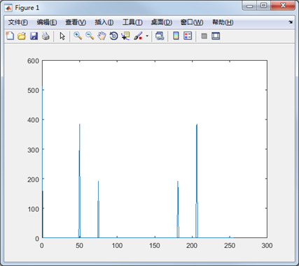 Fs = 256; % 采样率 N = 256; % 采样点数 n = 0:N-1; % 采样序列 t = 0:1/Fs:1-1/Fs; % 时间序列 x = square(2*pi*30*t, 50); %原始信号 y = fft(x); %对原始信号做FFT变换 M = abs(y); %求FFT转换结果的模值 plot(n, M); %绘制FFT转换模值的曲线