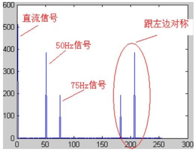 式中cos参数为弧度,所以-30度和90度要分别换算成弧度。我们以256Hz的采样率对这个信号进行采样,总共采样256点。按照我们上面的分析,Fn=(n-1)*Fs/N,我们可以知道,每两个点之间的间距就是1Hz,第n个点的频率就是n-1。我们的信号有3个频率:0Hz、50Hz、75Hz,应该分别在第1个点、第51个点、第76个点上出现峰值,其它各点应该接近0。实际情况如何呢?
