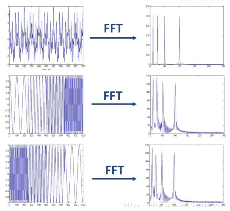 如上图,最上边的是频率始终不变的平稳信号。而下边两个则是频率随着时间改变的非平稳信号,它们同样包含和最上信号相同频率的四个成分。