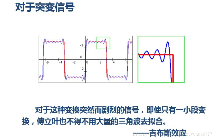 小波还有一些好处,比如,我们知道对于突变信号,傅里叶变换存在吉布斯效应,我们用无限长的三角函数怎么也拟合不好突变信号: