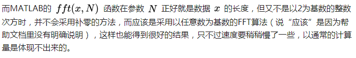 另外,说明一下,用MATLAB做FFT并不要求数据点个数必须为以2为基数的整数次方。之所以很多资料上说控制数据点数为以2为基数的整数次方,是因为这样就能采用以2为基的FFT算法,提升运算性能。