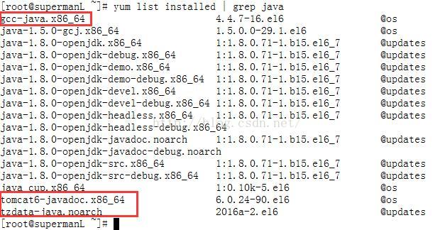 输入:yum list installed |grep java。(我是已经安装了一个1.8的,所以显示的截图如下,红色的部分并不属于jdk内容,但是因为含有java这个字符串,所以也一并显示出来了,这里我们可以不给予理会)