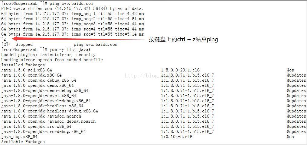 话,只需要ping一下百度就好啦。截图中,仅显示了部分jdk内容,除了1.8的之外,还有1.6,1.7等。这个到时候,可以根据自己的需要安装吧。(图中的^Z是按了键盘上的ctrrl + z。ctrl+c和ctrl+z都是中断命令,但是他们的作用却不一样.ctrl+c是强制中断程序的执行,而ctrl+z的是将任务中断,但是此任务并没有结束,他仍然在进程中他只是维持挂起的状态)