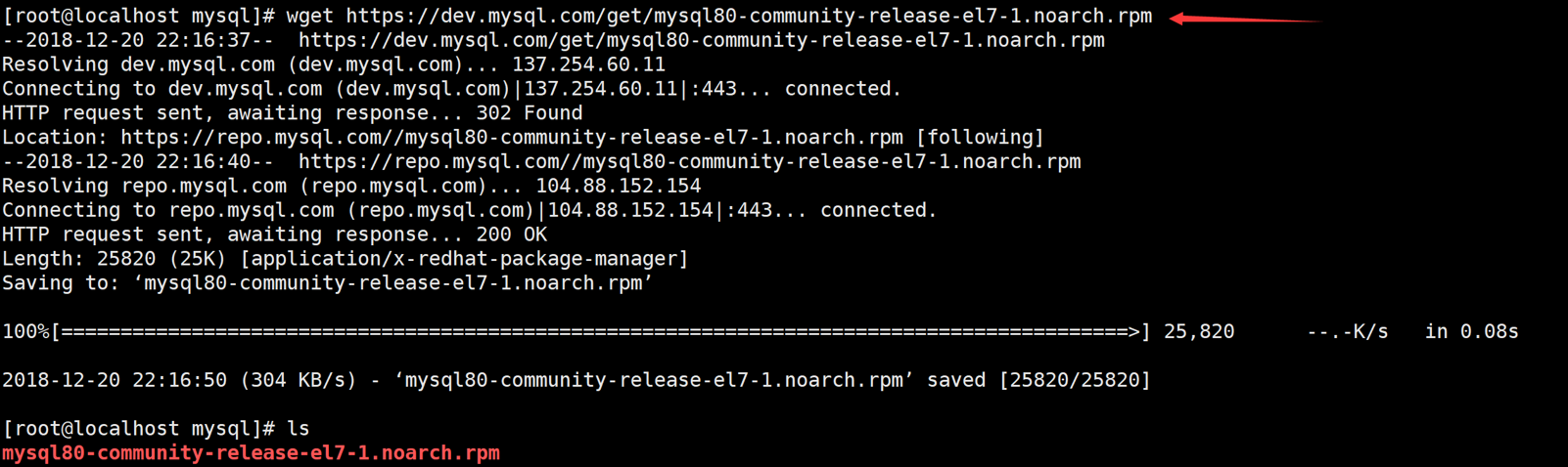 [root@localhost mysql]# wget https://dev.mysql.com/get/mysql80-community-release-el7-1.noarch.rpm