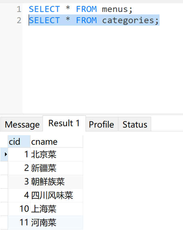 SELECT * FROM menus; SELECT * FROM categories;